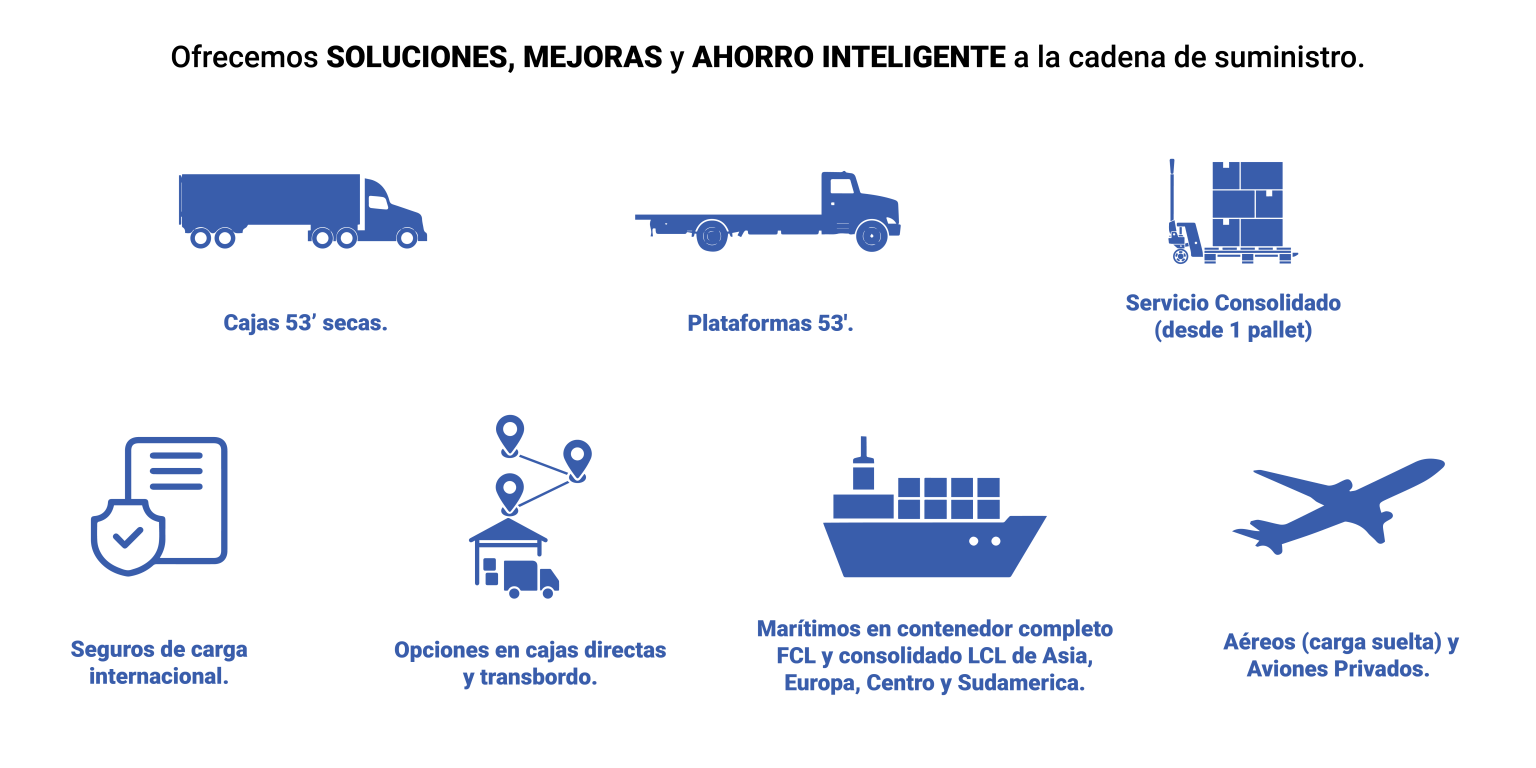Somos un agente de carga especializado en el TRANSPORTE INTERNACIONAL TERRESTRE a USA, Canadá y Centroamérica, MARÍTIMOS de Asia, Europa y Sudamérica y AÉREOS, incluyendo el servicio de avión privado de pasajeros.